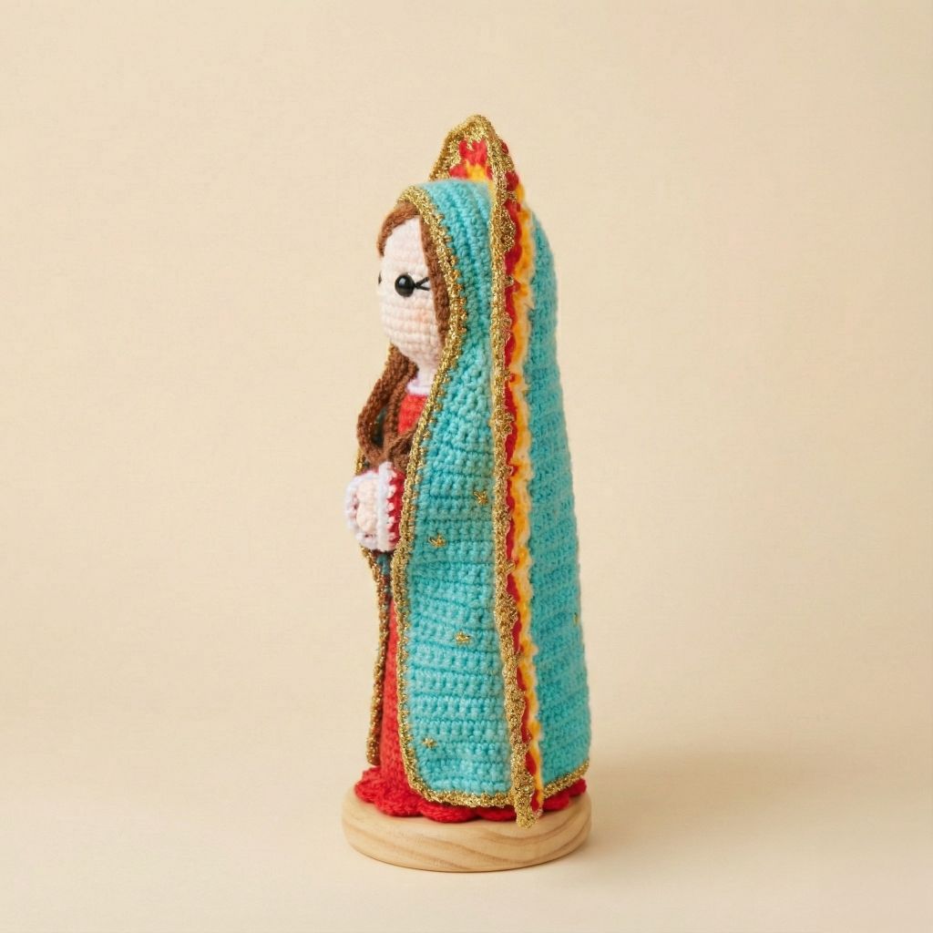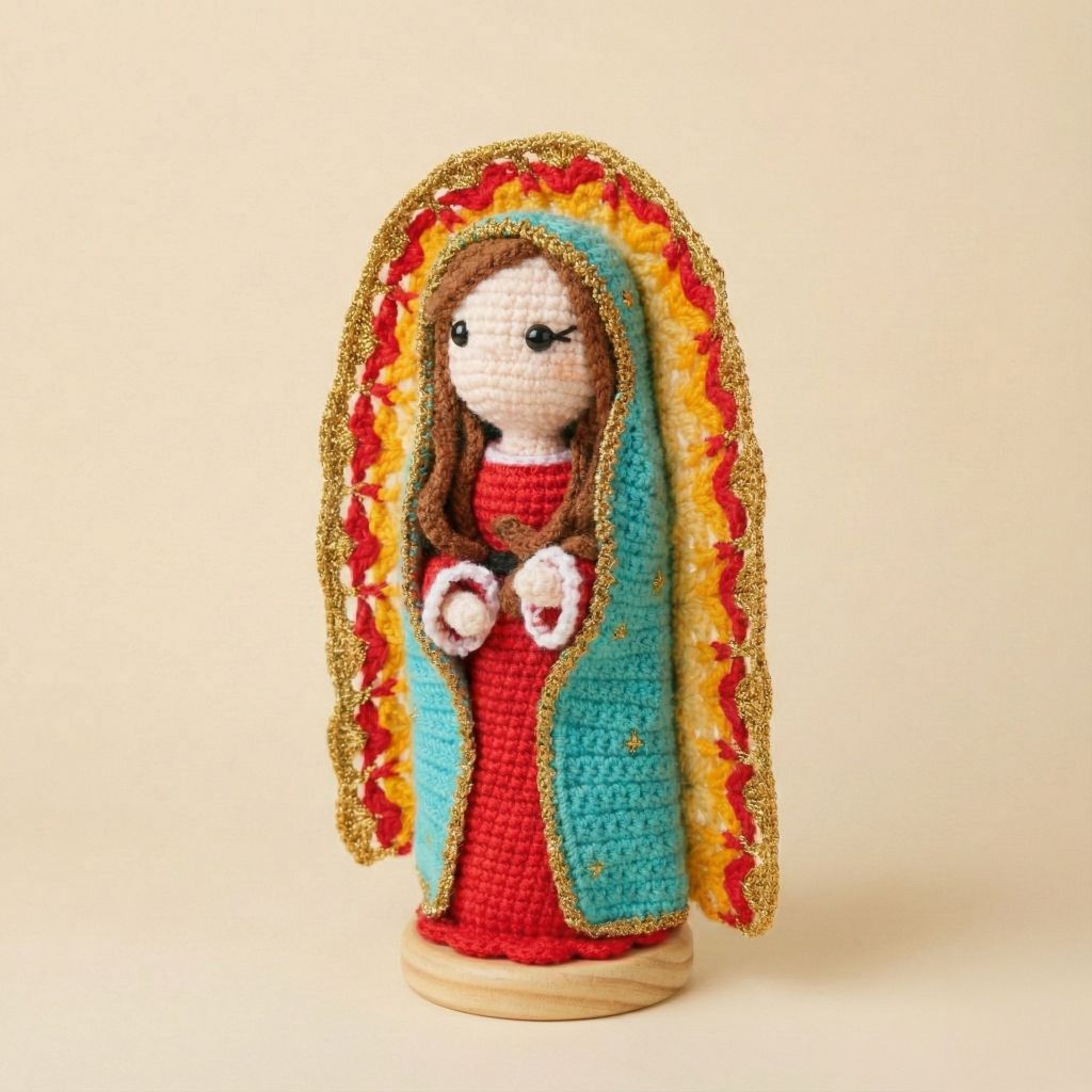 Amigurumi tejido a mano con detalles delicados que representan a la Virgen de Guadalupe. Una pieza llena de fe, ternura y tradición.